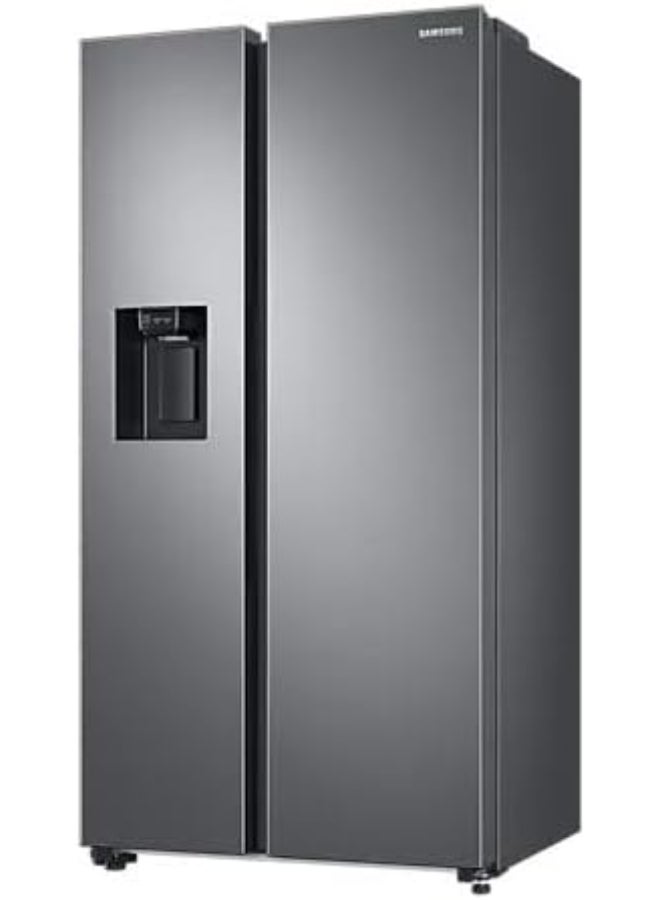 “Samsung Side by Side Refrigerator with water dispenser, Inverter technology, 634L capacity, and elegant Dark Silver finish.”